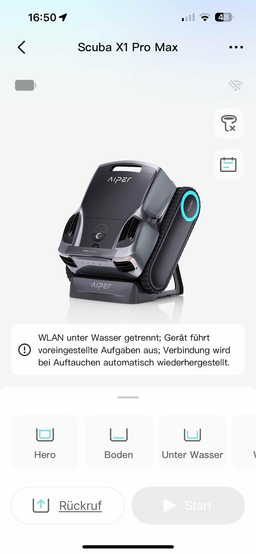 Trotz der sehr guten App ist sie im Alltag nicht zwingend nötig. Die wichtigsten Befehle – Start, Stopp, Moduswechsel – lassen sich direkt am Gerät eingeben. Gerade wer den Roboter nur ab und zu einsetzt, kann auf die App komplett verzichten. Einschalten, Modus wählen, ab ins Wasser. Die Knöpfe auf dem Kopf sind intuitiv wählbar.