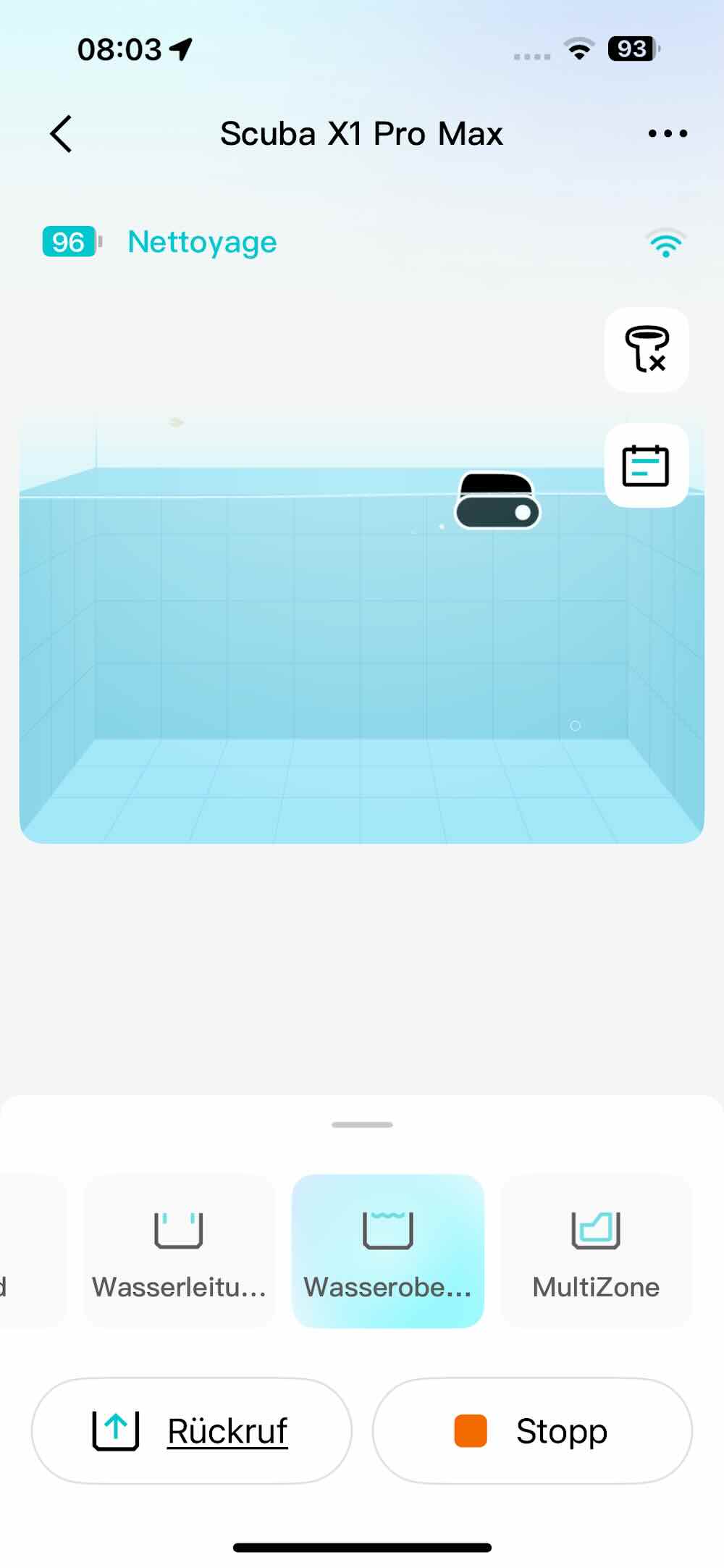 Das ist für mich eine echte Besonderheit: Der Aiper Scuba X1 Pro Max kann nicht nur den Boden und die Wände, sondern auch die Wasseroberfläche reinigen. Im entsprechenden Modus fährt er knapp unter der Wasseroberfläche und saugt Blätter, Insekten und Pollen ein. Er treibt dann gemütlich vor sich hin und fährt aber kontrolliert am Rand des Beckens entlang.