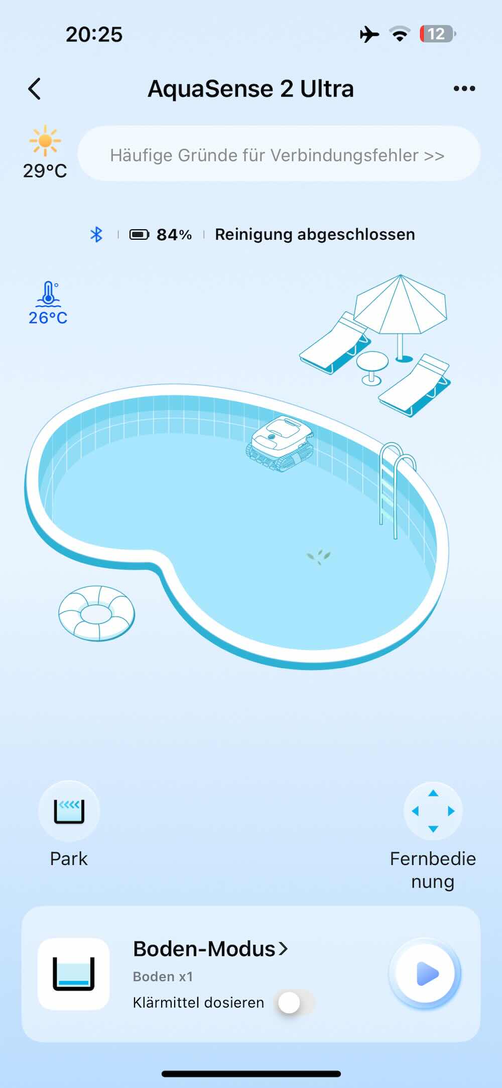 Mit einer Kapazität von 13.400 mAh bietet der Akku Laufzeiten von bis zu 5 Stunden im Boden-/Wand-/Wasserlinienmodus und bis zu 10 Stunden im Oberflächenmodus. Nach Beendigung der Reinigung fährt der Roboter automatisch in den Smart Surface Parking-Modus. Dank SmartDrain-System läuft das Wasser schnell ab, wodurch das Gewicht beim Herausheben sehr schnell reduziert wird. Die Ladezeit betrug bei mir etwa 4,5 Stunden. Die Laufzeit deckte sich ebenfalls mit den Herstellerangaben – damit war ich wirklich happy.