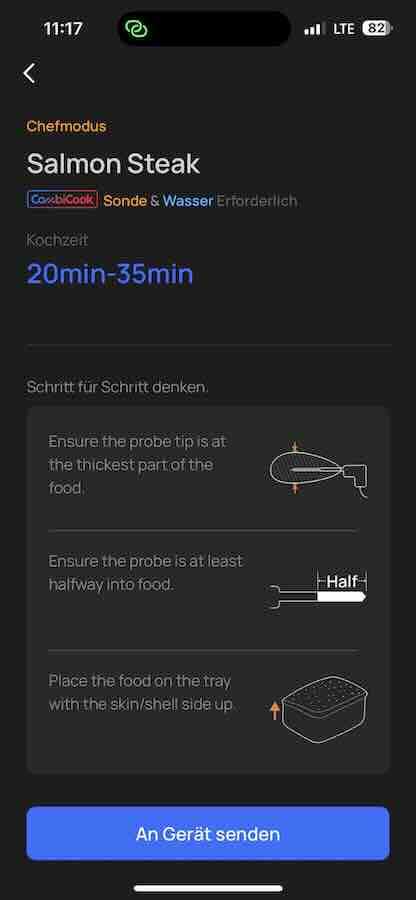 Direkt mit einem Lachsfilet starten, hätte nicht unbedingt sein müssen, aber durch einige andere Berichte im Internet sowie auch Videos, hatte ich darauf besondere Lust. Nun klickte ich mich zunächst durch das Menü und wählte das Lachsfilet aus. Vier schöne Stücke habe ich dann in den Korb gelegt und das Thermometer, oder die „Sonde“ via magnetischem Anschluss mit dem Korb verbunden. Die Sone habe ich nach Anleitung zum dicksten Punkt des Filets und mindestens bis zur Hälfte hineingeschoben. Korb rein, Start gedrückt und abwarten.