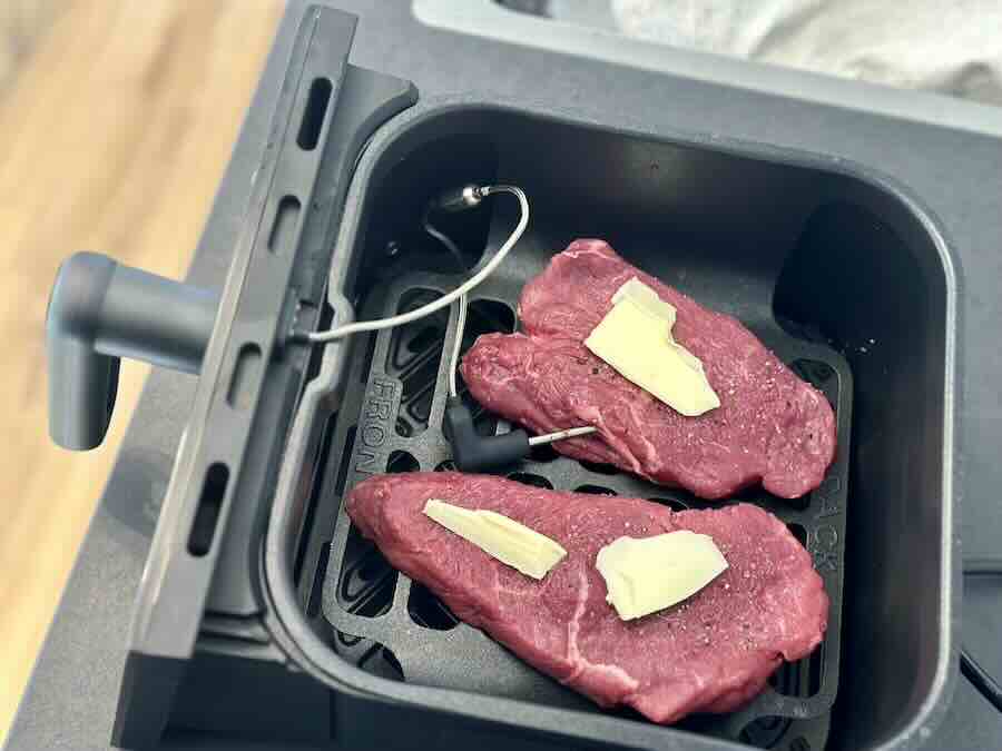 Kurzum: Das Lachsfilet war außen unglaublich knusprig, innen super saftig und es ist beinahe schon zerfallen, wenn man die Gabel annäherte. Auch ein Steak habe ich auf dieser Art und Weise gemacht. Ich war von den Ergebnissen begeistert und füge nachstehend ein paar Bilder ein, um euch einen Eindruck davon zu geben. Auch Hähnchen, Pommes oder Nuggets waren immer sehr knusprig und goldbraun gebraten. Ab und zu musste man bei normalen Gerichten noch mal drei bis fünf Minuten verlängern, bis der gewünschten Bräunungsgrad erreicht war, bei allen Gerichten mit der Sonde wurde jedoch auf den Punkt perfekt abgeliefert. Wirklich klasse!