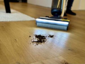 Doch genug von allen Funktionen in der Theorie. Ich habe mir den Nasssauger gründlich angesehen und auch verschiedene Szenarien nachgestellt. Danke der Mithilfe meiner kleinen Tochter, waren manche Szenarien nicht einmal gestellt, sondern der Nasssauger konnte unter realen Bedingungen seine Arbeit verrichten. Beispielsweise bei halb festgetrocknetem Brei oder einer verschütteten Tasse Wasser. Ich habe den FLOOR ONE S7 FlashDry Pet im Wohnzimmer stehen, wo er aus vielen Ecken des unteren Geschosses gut erreichbar ist. Und besonders für Küche und Esszimmer schnell griffbereit ist – dort, wo sein Haupteinsatzgebiet zu sein scheint.